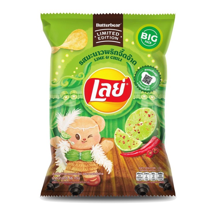 เลย์คลาสสิค รสมะนาวพริกจี๊ดจ๊าดXButter Bear รสชาติความคลาสสิคที่คนไทยคุ้นเคย ผสมผสานความจี๊ดจ๊าดของมะนาวและพริกเผ็ดร้อนอย่างลงตัว เติมเต็มรสเค็มจากเกลือที่ช่วยเพิ่มรสชาติให้เข้มข้นขึ้น ปรุงอย่างพิถีพิถันเพื่อปลุกทุกต่อมรับรสให้ตื่นเต้น พร้อมภาพลักษณ์น้องหมีเนยสุดน่ารัก เพิ่มความสดใสให้การทานขนม เหมาะสำหรับคนที่ชอบขนมรสจัดจ้าน มีรสเปรี้ยว เผ็ด เค็ม ครบจบในซองเดียว