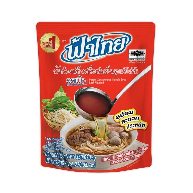 ฟ้าไทย น้ำก๋วยเตี๋ยวสำเร็จรูปเข้มข้น “รสเนื้อ กลิ่นหอมเนื้อและเครื่องเทศ ให้รสชาติหวานเค็มกลมกล่อม เหมาะสำหรับเมนูน้ำก๋วยเตี๋ยวเนื้อสด เนื้อเปื่อย และก๋วยเตี๋ยวเนื้อทุกชนิด