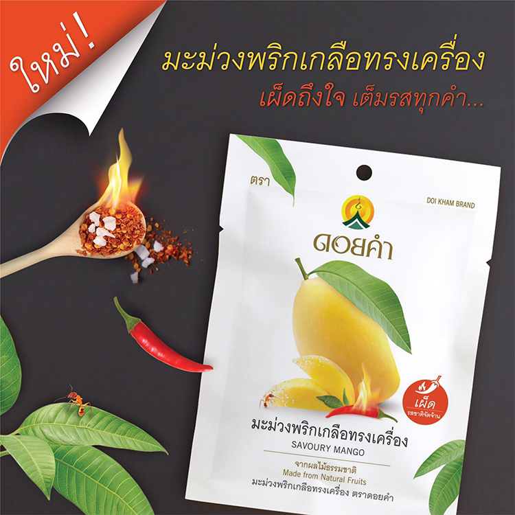 왕실 프로젝트의 하나로 과일향과 맛이 그대로인 퀄리티가 높은 말린 과일 스낵이랍니다. 도이캄만의 특별한 기술로 건조하여 과일의 맛과 질감을 잘 유지하고 있습니다. 도이캄의 Savoury 세이버리 제품은 조금 더 태국 문화에 친숙해 질 수 있도록 태국인 현지인의 과일 먹는 방법, 즉 소금, 설탕, 칠리가 섞여 있는 양념 가루 소스를 찍어먹으면 더운 날씨도 이겨낼 수 있다는 맛있는 방법을 소개하고 있습니다.