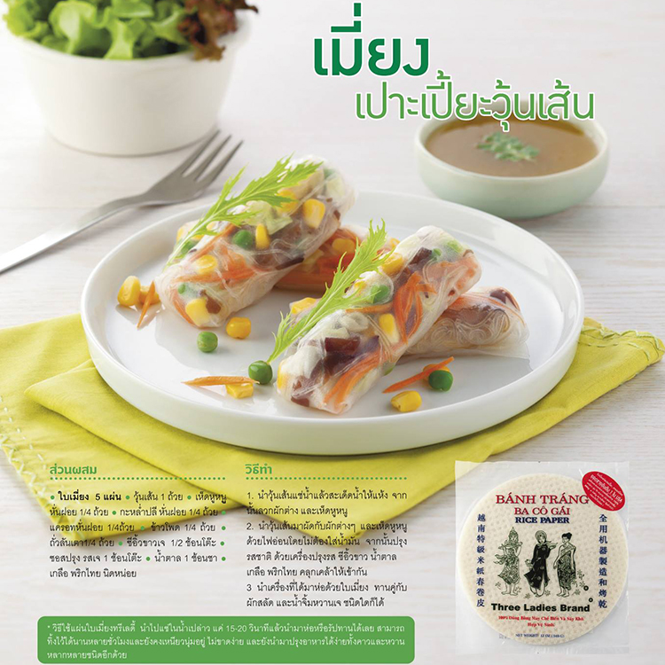 사람들의 건강을 위한 좋은 품질의 재료로 만들어진 트리레이디스 브랜드의 라이스 페이퍼는 동남아시아 지역 뿐만 아니라 전 세계적으로 인기있는 브랜드로 자리하고 있습니다. 베트남 월남쌈을 집에서 직접 만들어 먹기에 간편하도록 만들어진 라이스 페이퍼는 태국에서도 굉장히 많이 사용되고 있습니다. 태국어로 뻐삐야라고 불리는 스프링롤, 춘권을 태국음식점에서 맛보셨다면 이제 집에서도 만들어 드세요!