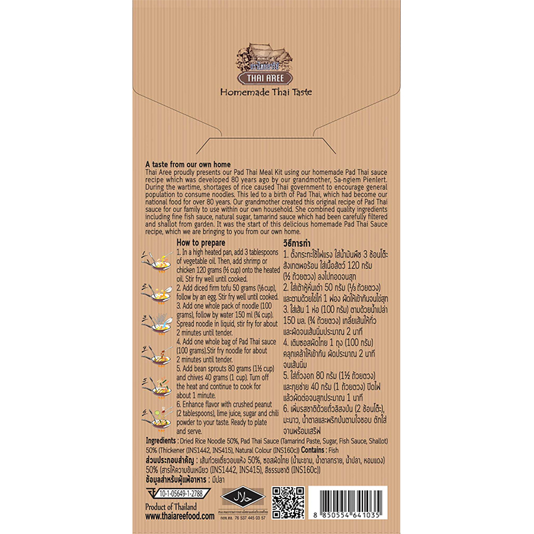 타이 아리(Thai Aree)는 약 80년 전에 할머니가 개발한 수제 팟타이 소스 레시피를 사용하여 팟타이 키트를 자랑스럽게 선보입니다. 집에서 맛있게 먹던 우리 할머니의 자랑스러운 오리지널 팟타이 소스 레시피를 온 가족 뿐만 아니라 여러 태국 사람들까지 맛있게 먹을 수 있게되었습니다. 고급 생선 소스와 천연 설탕, 조심스럽게 걸러진 타마린 소스, 정원에서 재배한 샬롯 등 양질의 재료를 조합하여 만들어졌으며 집에서 시작된 수제 소스가 타이 아리 팟타이 소스 레시피의 시작이 되었습니다.